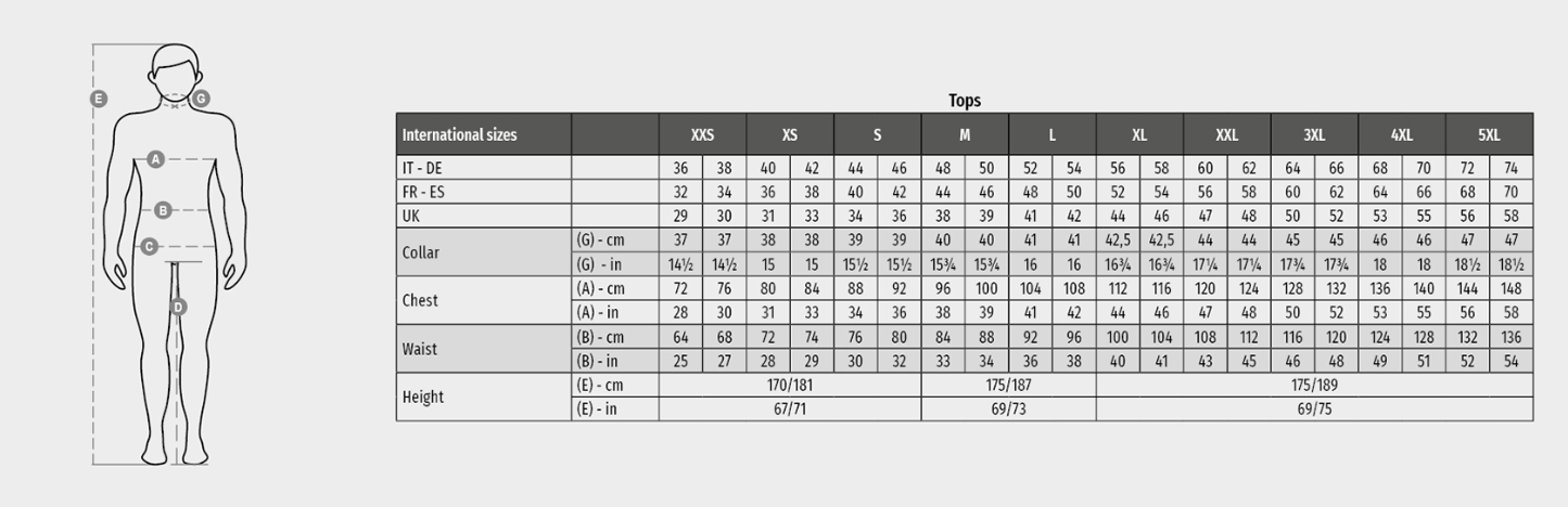 Men’s short-sleeved crew neck t-shirt, with 1.5 cm spandex mix rib neckband with top stitching on the front, shoulder-to-shoulder reinforcement tape, stretch seams, side seams. No label